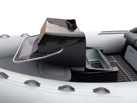 Console centrale équipé de main courante inox, pare-brise et assise avec dossier avant Table de cockpit – Pompe de cale – Bimini inox avec toile Sumbrela noire Echelle de bain télescopique Banquette pilote double avec 3 positions d’assise – Large banquette arrière