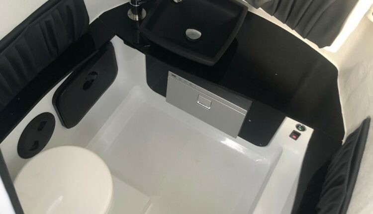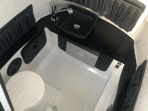 Guindeau électrique. Grand bain de soleil avant avec une table. Console équipé d’une assise avant, un WC, lavabo et frigo. Banquette arrière faisant face à la cuisine extérieure : réfrigérateur, évier. Plateformes arrière avec échelle de bain et douchette. Bimini escamotable sous banquette arrière lui donnant une ligne très épuré.