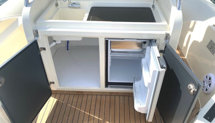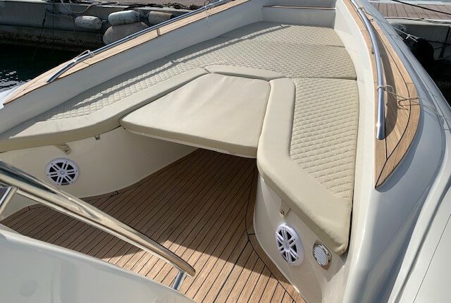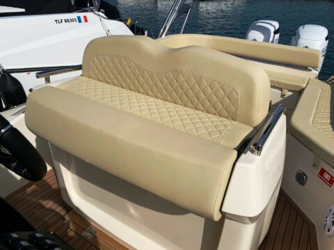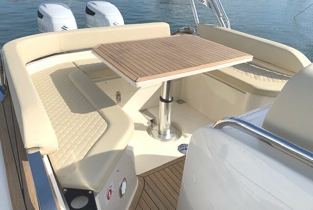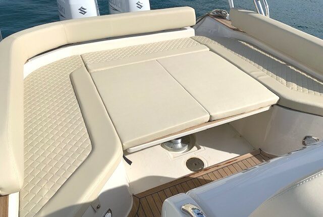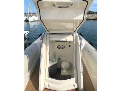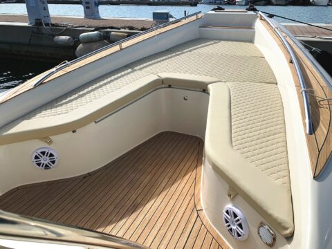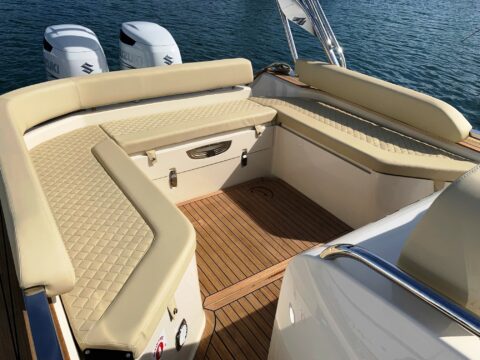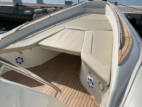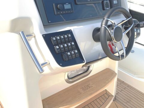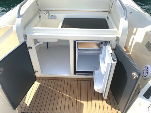 Cuisine extérieure avec frigo, évier et nombreux rangements. Grand bain de soleil avant. Accès facile aux grandes plateformes de bain. Assise devant console, banquette double de pilotage avec position assise ou type leaning post, douchette, grand bimini sur rollbar inox, feux de navigation, guindeau électrique, nombreux coffres de rangement. Commande moteur électrique, direction hydraulique Seastar.