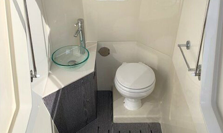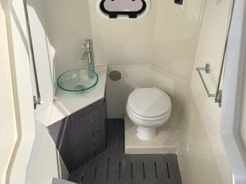 Cabine avec WC électrique, lavabo. Pont en theck.