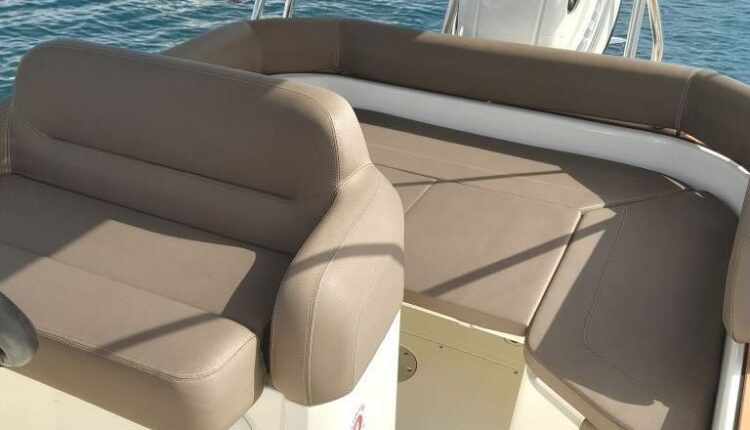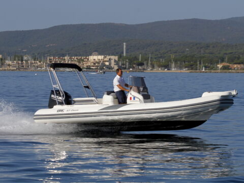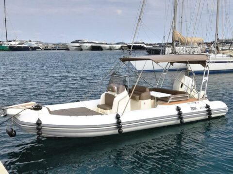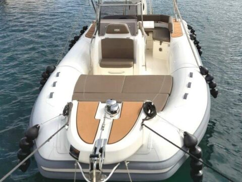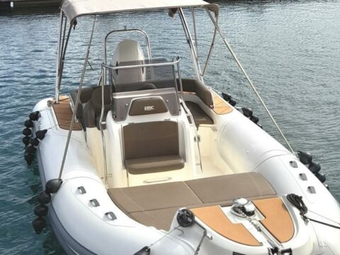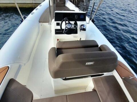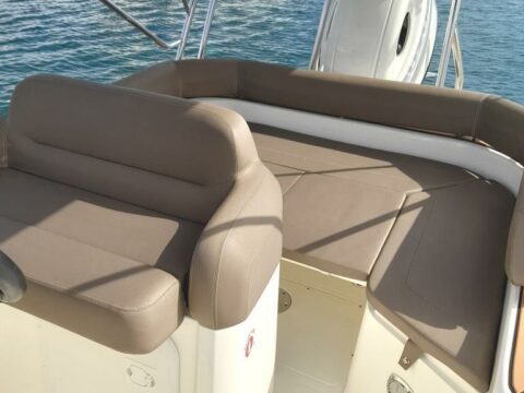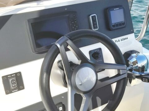 Equipements en options inclus : Delphinière avant avec guindeau électrique, ancre et chaine inox, direction hydraulique Seastar, douchette avec réservoir fixe de 60 L, taud de console, taud de leaning post, taud de dossier de banquette arrière. Roll bar inox avec bimini en toile Sumbrella taupe. Klaxon et feux de navigation en inox sur Roll-Bar. Sondeur GPS couleur Garmin Echomap 62 cv + carte méditerranée. Antifouling. Kit mouillage, kit amarrage. Armement de sécurité pour 10 personnes jusqu’à 6 miles complet. Arche de ski. Revêtement synthétique : delphinière avant, plateformes arrières et dossier.