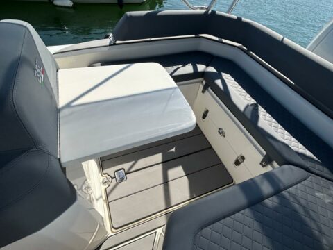 Grand bain de soleil avant. Carré arrière en U avec table de cockpit transformable en grand bain de soleil arrière. Assise devant console, douchette, tablette de cockpit, grand bimini sur rollbar, feux de navigation, banquette de pilotage position assise ou type leaning post, guindeau électrique, nombreux coffres de rangement. Commande moteur électrique, direction hydraulique Seastar. Electronique : sondeur GPS Garmin grand écran
