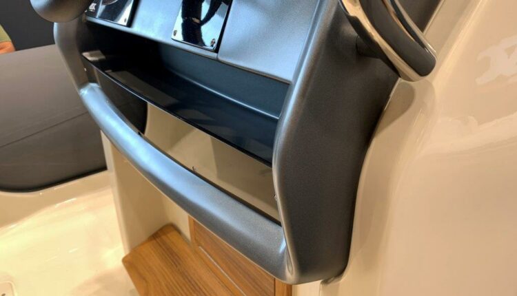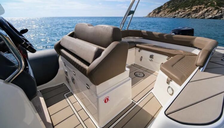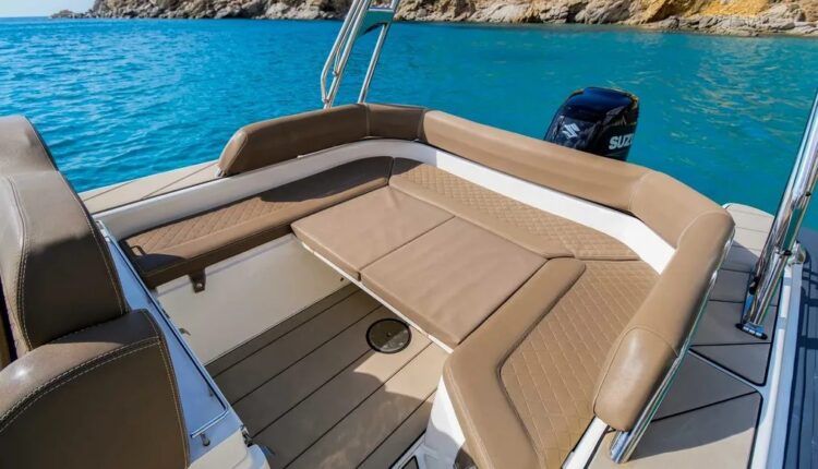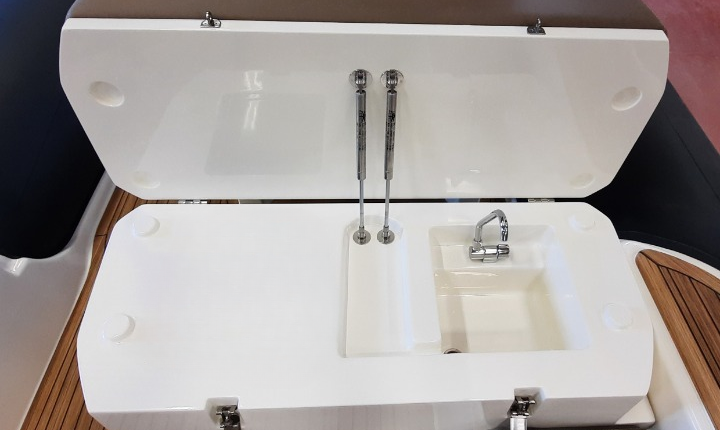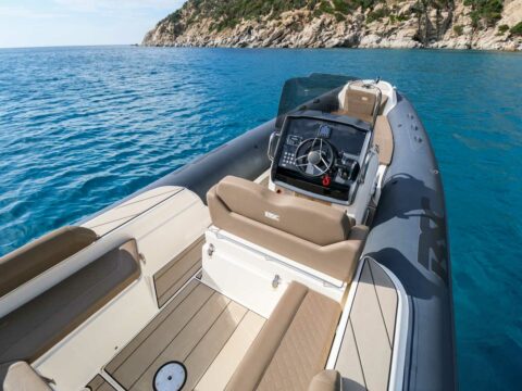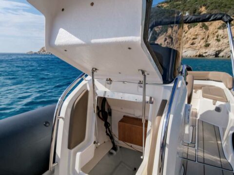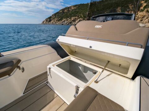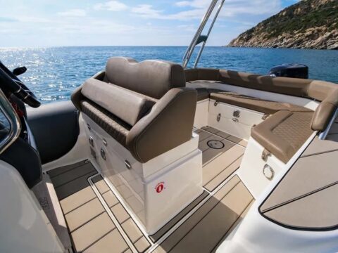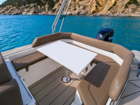 Confort : Plan de pont très spacieux avec une banquette arrière en U et convertible en bain de soleil arrière. Table de cockpit. Bain de soleil avant. Leaning post double assise avec bloc cuisine extérieure (frigo, évier, plan de travail). Console de pilotage avec assise avant et grand coffre de rangement. Grandes plateformes de bain avec échelle de bain télescopique intégrée.