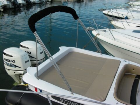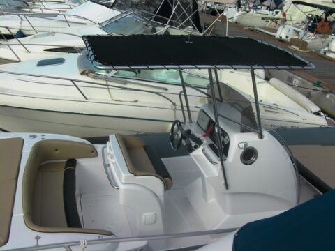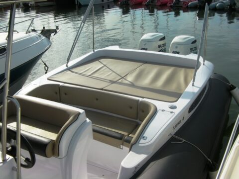 2 grands espace bain de soleil avant et à l’arrière (équipé d’un taud de soleil à l’arrière) Taud de soleil sur la console. Cabine dans la console centrale , nombreux coffres de rangement, grande plate-forme de bain arrière avec échelle télescopique, guindeau électrique, Frigo et évier extérieur, Radio MP3 puissante, feux de navigation. Electronique : Combiné tactile GPS Sondeur Garmin.